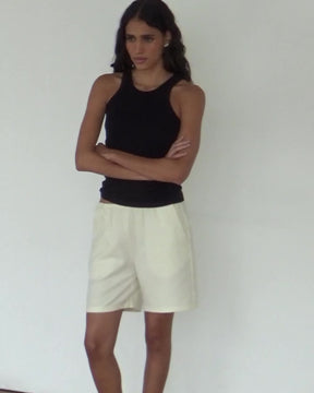 The Drew Shorts are 90s-inspired, tailored, mid-thigh short with a pull-on elastic waistband for ultimate comfort. Cut in the same twill fabric as our staple Drew Pants, these shorts are easy to style, whether you dress them up with kitten heels or down with a staple white tee and ballet flats. It's giving effortless, tomboy chic.