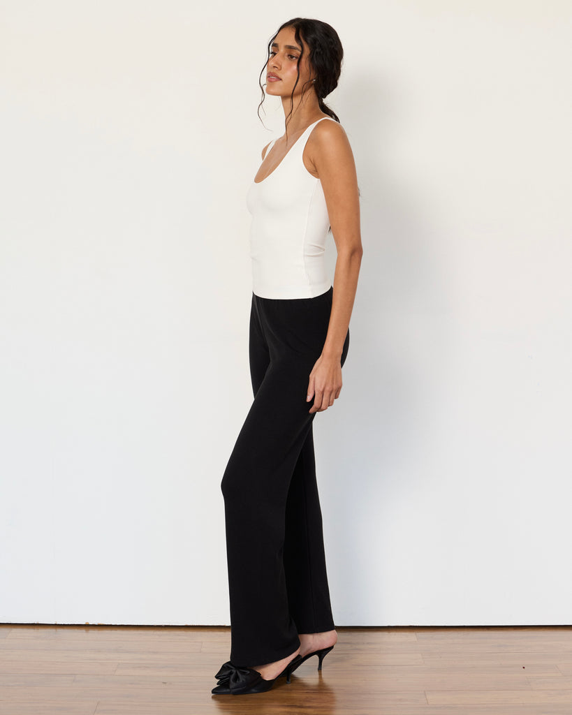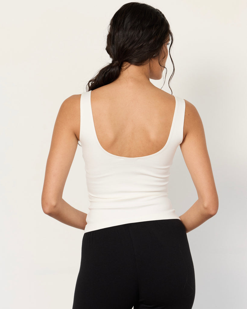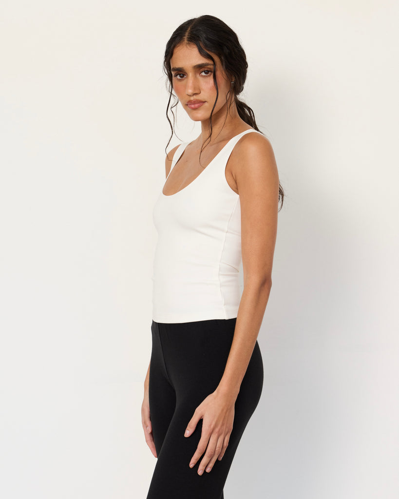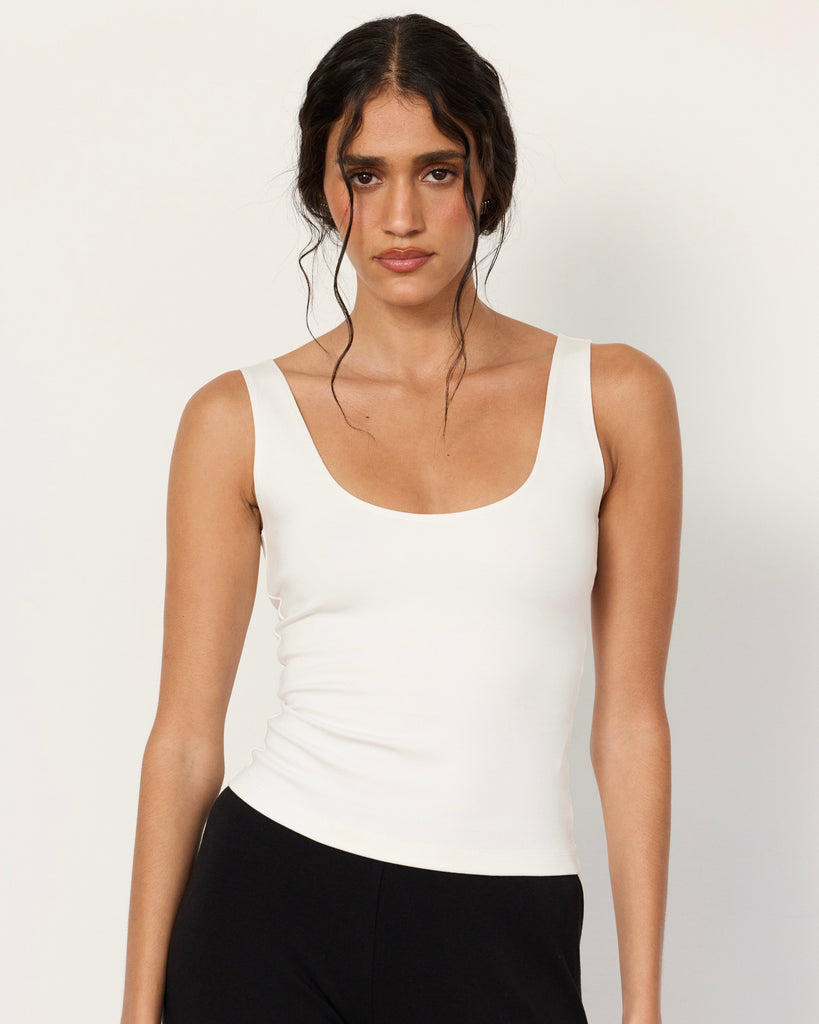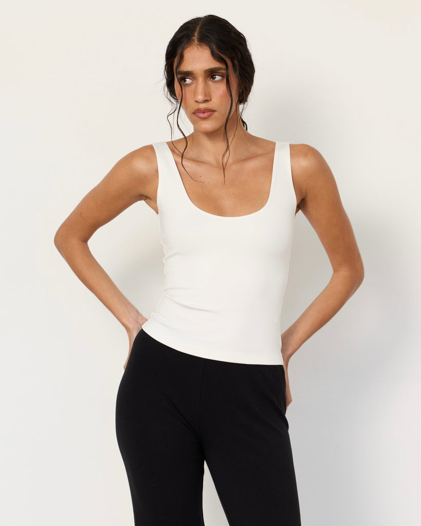A refined essential with structure and ease. The Inez Tank features thick, wide straps and a body-hugging silhouette designed to flatter and support — perfect for going braless. Crafted in a luxe, structured fabric, it fits close to the body while offering a clean, minimal shape.