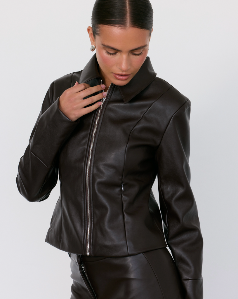 Your elevated take on the classic leather zip-up. Crafted from buttery-soft vegan leather in a rich dark espresso, the Alba Jacket features clean panel lines, a structured collar, and a close-to-the-body fit that hits right at the waist. Fully lined with satin for ultimate comfort. Style with the matching Ellis Leather Mini Shorts.