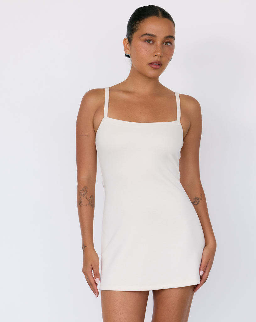 Cut from the same softly structured fabric as the Inez Tank, the Rhea Mini offers the perfect balance of ease and polish. Designed with a flattering fit-and-flare silhouette, it hugs through the bodice before gently releasing at the skirt. Comfortable straps frame the neckline, making it a piece that can be worn effortlessly on its own, bra optional, or layered under a jacket. Minimal yet feminine, Rhea is a go-to dress for both everyday wear and elevated occasions.