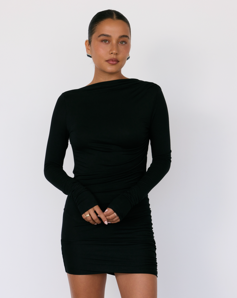 The Romy Mini is a study in refined minimalism. Crafted from a soft, sculpting stretch jersey, this long-sleeve silhouette is artfully ruched to contour the body, creating a fluid, second-skin fit. The high neckline offers a sleek, elevated front, while the plunging open back adds an element of allure, draped to perfection with a sculptural cowl.